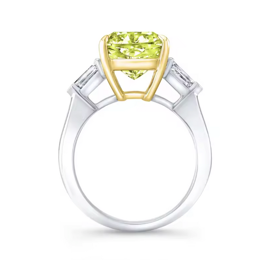 Sale price From €2.469,00A bold celebration of color, balance, and refined craftsmanship.This striking three-stone diamond ring features a fancy intense or vivid yellow cushion-cut lab-grown diamond as its radiant center, flanked by sleek bullet-cut lab-grown diamond side stones. The geometric contrast between the soft cushion shape and the clean lines of the bullet cuts creates a sophisticated, architectural silhouette. Available with a 1 or 2 carat IGI-certified center...