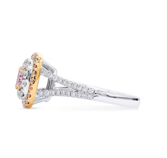 Sale price €2.546,00This breathtaking ring showcases a cushion-cut pink lab-grown diamond, elegantly framed by a shimmering halo of pavé diamonds. Crafted in a sophisticated two-tone combination of 18K white and rose gold, the design highlights the soft blush tones of the center stone while adding depth, contrast, and brilliance. The split shank band, adorned with pavé-set diamonds, enhances the ring’s sparkle from every angle and creates a... -