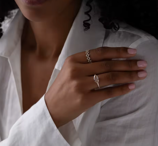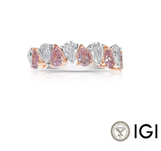 Sale price €2.199,00Delicate yet expressive, this half eternity diamond ring features a graceful combination of pink and white pear-cut lab-grown diamonds of 1.88 ct total, set in a sophisticated two-tone design of 14K white and rose gold. The alternating colors and elegant pear shapes create a soft rhythm of sparkle, romance, and contrast. The half eternity setting offers lasting comfort while delivering beautiful brilliance across the band,... -