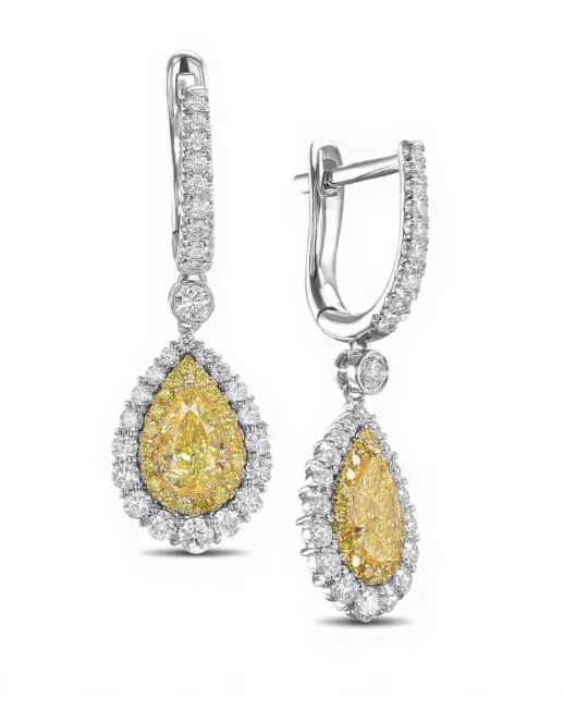 Sale price From €3.942,00These striking earrings feature fancy intense yellow pear-cut lab-grown diamonds, available in 1 or 2 carats each, designed to captivate with depth, color, and brilliance. Crafted in an elegant two-tone combination of 14K white and yellow gold, the design enhances both sparkle and contrast. Each center diamond is framed by a double halo of lab-grown diamonds, amplifying the presence of the pear shape while adding... -