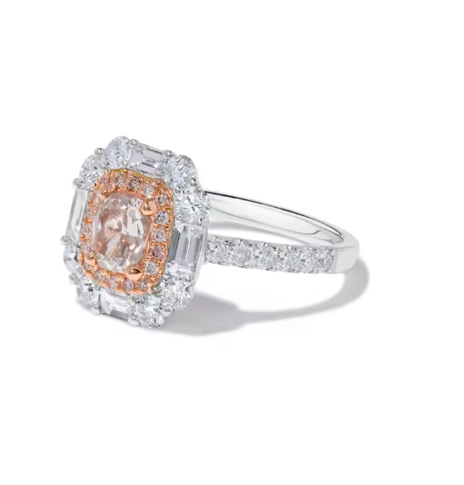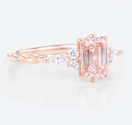 Sale price €2.436,00This refined ring features a stunning 1.5 carat pink emerald-cut lab-grown diamond as its center stone, beautifully set in warm 14K rose gold. The clean lines of the emerald cut highlight the diamond’s soft pink hue, creating a look that is both elegant and contemporary. The center stone is gracefully accented by a combination of marquise and round lab-grown diamonds, adding dimension, sparkle, and a... -