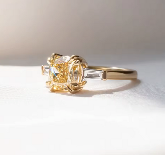 Sale price €2.942,00This beautiful three-stone ring features a radiant 2.0 carat yellow cushion-cut lab-grown diamond as its center stone, set in classic 14K yellow gold. The cushion cut’s soft edges and depth enhance the diamond’s rich yellow hue, creating a warm and luminous focal point. Flanked by two complementary lab-grown diamonds, the three-stone design symbolizes past, present, and future, making this ring a meaningful choice for an... -
