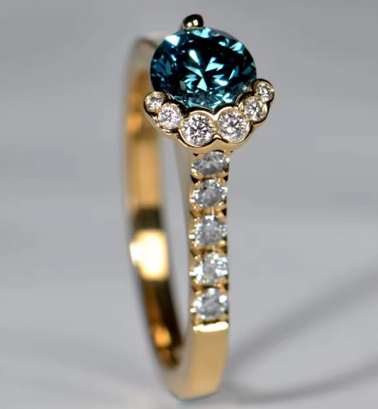 Sale price €1.542,00This luxurious ring features a captivating 1.0 carat blue round-cut lab-grown diamond as its center stone, IGI certified for quality and authenticity. Crafted in warm 14K yellow gold, the design highlights the rich blue hue of the center diamond while offering timeless elegance and brilliance. The center stone is beautifully accented by round-cut lab-grown diamonds, adding refined sparkle and balance without overpowering the bold color... -