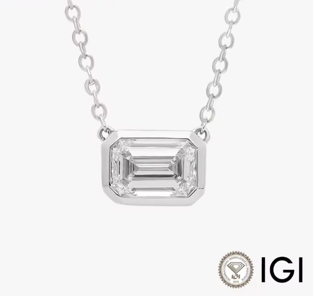 Timeless sophistication with a modern edge. This elegant pendant features a lab-grown emerald-cut diamond, beautifully framed in a sleek bezel setting that highlights the diamond’s clean lines and mirror-like facets. Available in 1.0 to 3.0 carats, the emerald cut offers understated brilliance and refined elegance.